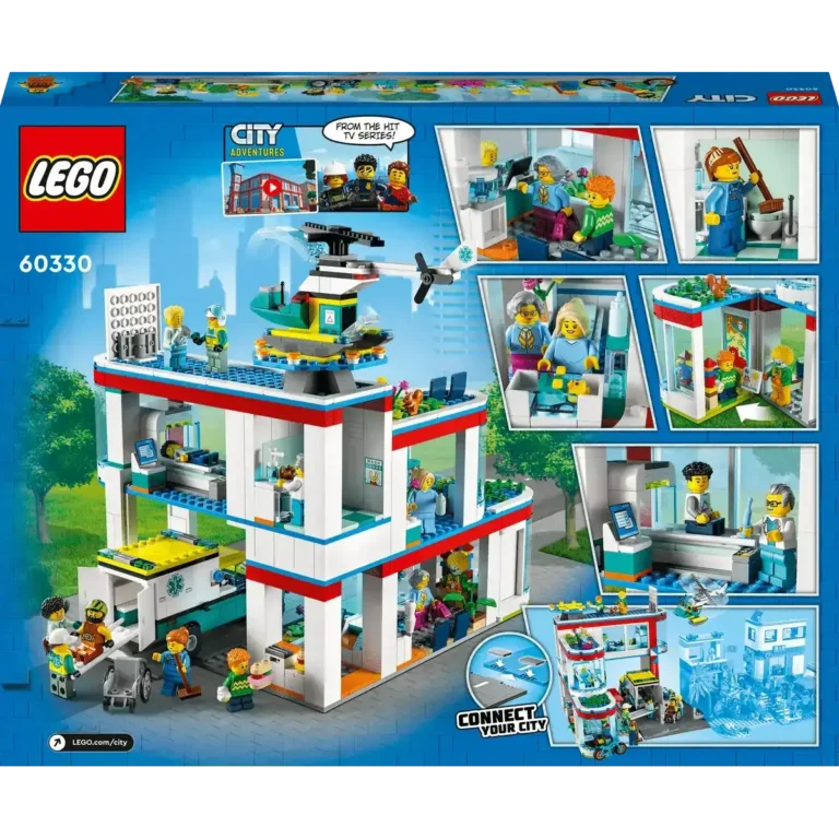 Lassen Sie Kinder mit dem LEGO® City Krankenhaus (60330) in eine Spielwelt eintauchen, die mit faszinierenden Funktionen aufwartet. Das beeindruckende Gebäude enthält eine Aufnahme mit einer Spielecke, eine Geburtsstation, eine Toilette und ein Zimmer für MRT-Scans. Das Set enthält zudem einen Rettungswagen, einen Rettungshubschrauber, Straßenplatten zum Anbauen anderer LEGO Sets und 12 Minifiguren, darunter auch 4 Charaktere aus der beliebten TV-Serie „LEGO City – Abenteuer“.